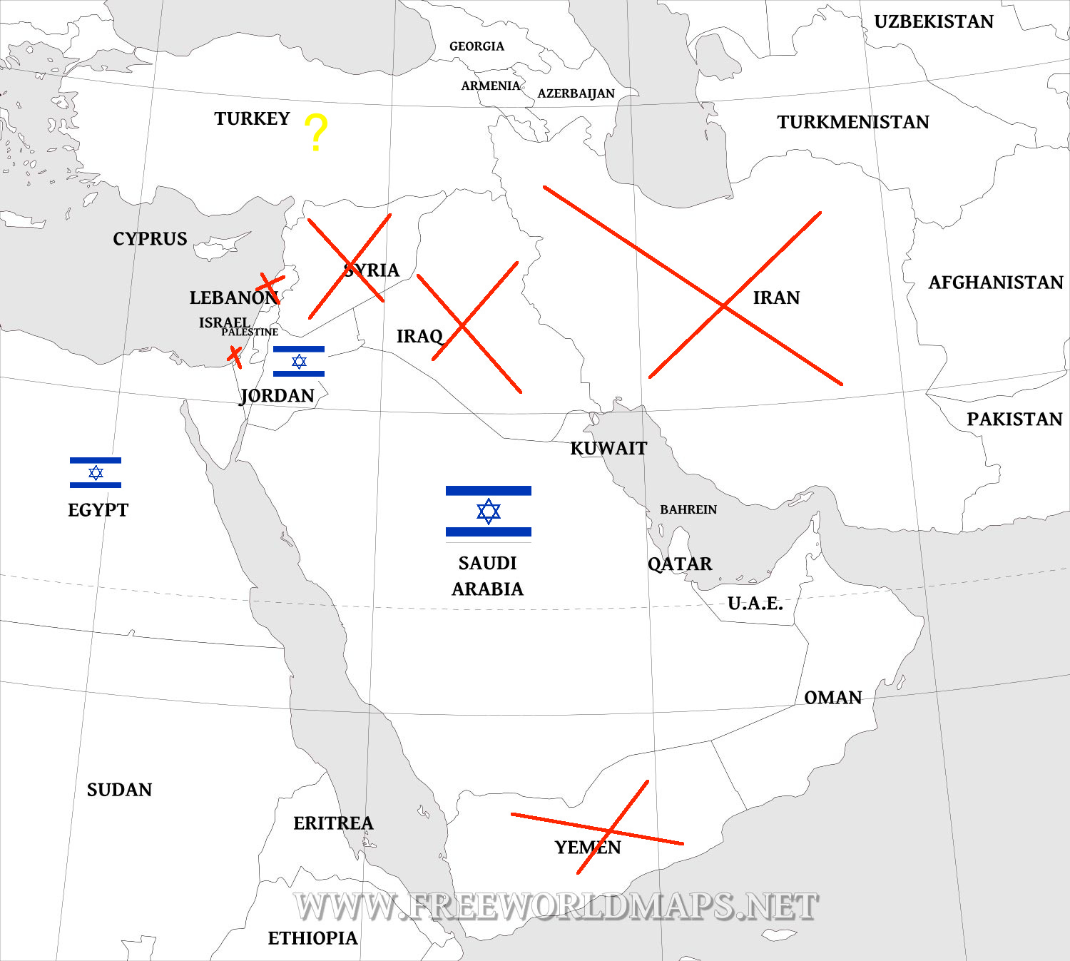 Egypt, Saudi Arabia, and Jordan are allied with Israel, while Hezbollah, Hamas, Syria, Gaza, Iran (now, as predicted both before the attack and at the start of the year, based on false allegations regarding Iranian nuclear breakout1), Iraq, Yemen have all been destroyed, rendered unable to effectively oppose Israel if they even wanted to (which itself is an open question2). Israel has already seized parts of southern Lebanon and large parts of Syria, and the rest of Syria is controlled by a CIA frontman pretend Islamicist who may well be a secret Jewish Mossad agent, while the ethnic cleanse of Gaza is ongoing.