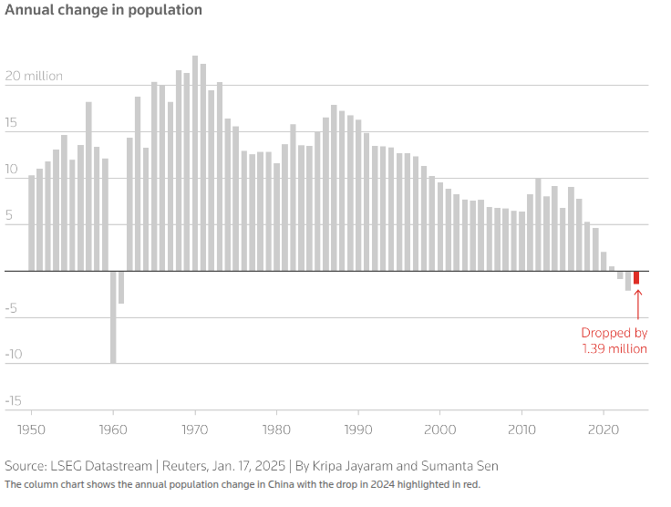 China's population fell for a third consecutive year in 2024, with the number of deaths outpacing a slight increase in births, and experts cautioning that the trend will accelerate in the coming years. The National Bureau of Statistics said the total number of people in China dropped by 1.39 million to 1.408 billion in 2024, compared to 1.409 billion in 2023. Friday's data reinforces concerns that the world's second largest economy will struggle as the number of workers and consumers declines. Rising costs from elderly care and retirement benefits are also likely to create additional strains for already indebted local governments. The high cost of childcare and education as well as job uncertainty and a slowing economy have also discouraged many young Chinese from getting married and starting a family. Gender discrimination and traditional expectations for women to take care of the home exacerbate the issue, demographers say.