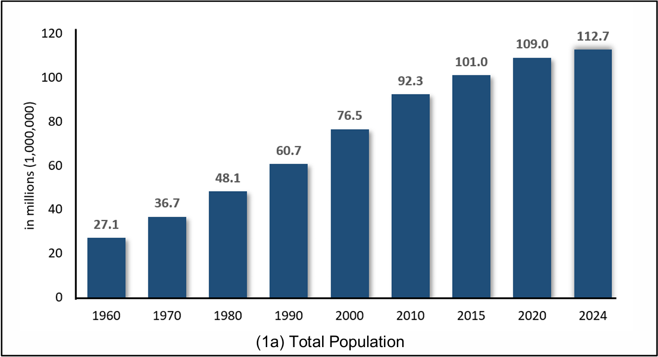 The population and the population growth rate (PGR) are two different things. The population refers to the total number of people, while the PGR measures the rate at which that number increases over time. Despite an increase in the overall population size, the PGR has declined, from 1.63% between 2015 and 2020, to 0.80% between 2020 and 2024. The country’s PGR has been generally declining since 1960 to 1970, when it was recorded at 3.01%.