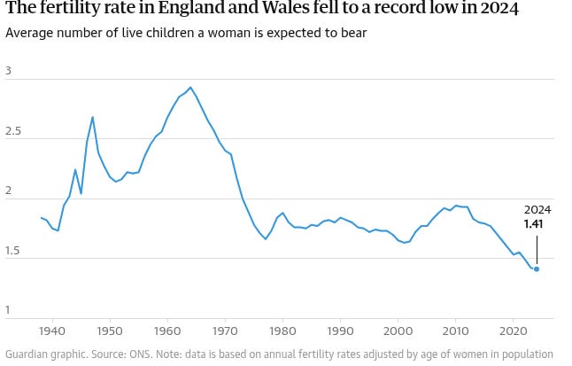 The fertility rate for England and Wales has fallen for the third year in a row to reach a record low, figures show. The total fertility rate across both countries, meaning the average number of live children women can expect to have across their child-bearing life, stood at 1.41 in 2024, down from 1.42 in 2023, the lowest since comparable data was first collected in 1938, according to the Office for National Statistics (ONS). This is despite a 0.6% increase in live births last year, with a 14% increase in the number of babies born to fathers over 60, according to figures published last month. Bernice Kuang, a demography researcher at the University of Southampton, said the fall in fertility rates could be a temporary result of people postponing having children.