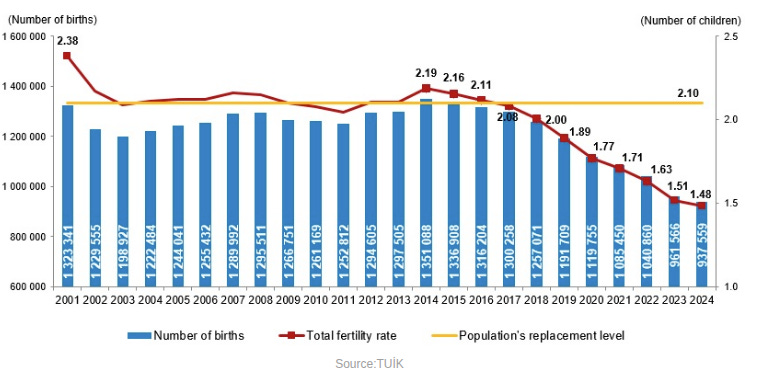 Turkey’s birth rate has plunged to its lowest level in modern history, prompting warnings from officials and experts, who say the country is facing a demographic crossroads. Recent data from the Turkish Statistical Institute (TÜİK) show that the total fertility rate in 2024 fell to 1.48 children per woman, well below the population replacement level of 2.1 and a steep decline from 2.38 in 2001. The number of live births in 2024 stood at 937,559, with boys accounting for 51.4 percent and girls for 48.6 percent. This marks a continuation of a trend that demographers and economists say is increasingly linked to economic hardship in Turkey, particularly among young adults of childbearing age.