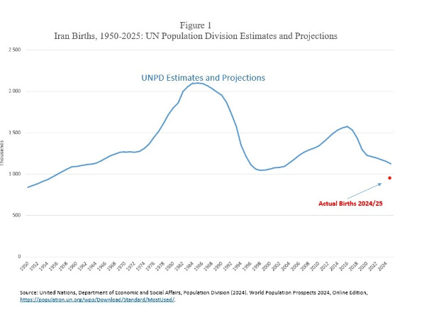 Despite exhortations from ruling clerisy to be fruitful, and pro-natal policies intended to prop up birth rates, fertility in Iran is slumping once again. Earlier this month, the Tehran Times reported that annual births in Iran fell below the million mark. According to the Civil Registration Organization in charge of Iran’s vital statistics, just under 980,000 births were recorded between the Iranian calendar year coinciding with 21 March 2024 through 20 March 2025. It has been a very long time since so few babies were born in Iran. By the reckoning of the United Nations Population Division, we have to go back seventy years—to 1955—to find a time when Iranian annual birth totals were lower than today. The current birth level, as we see in Figure 1, is less than half as high as it was forty years ago, in 1985.