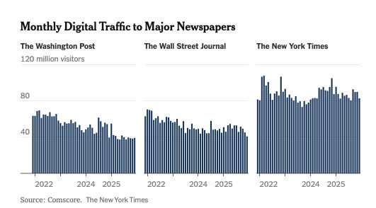 But Bezos himself ruined this opportunity for the paper. In 2024, Bezos intervened in the editorial page to prevent an endorsement of Kamala Harris, which was a violation of the promise he made in 2013 when he bought the paper. That decision led to 200,000 subscription cancelations. We don’t know how many the paper has left, but the guess was that it had 2.5 million before Bezos’s intervention. So the drama aside, that’s… not a bad number of customers. And actual traffic to the Washington Post is still pretty good. Here’s a chart from the New York Times.