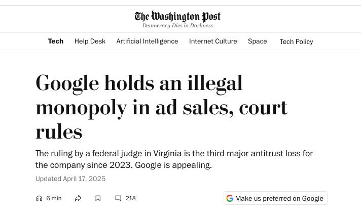 As Judge Leonie Brinkema ruled, Google has been systematically monopolizing the technology and process for selling advertising on the open web, exactly the kind of ads the Post sells. Google controls ad revenue and distribution, and it has used that power to kill thousands of newspapers in America by monetizing the work they do and taking that money for itself. And it is this behavior, the diversion of revenue from publishers to tech monopolies, that led to the Washington Post becoming the plaything of a billionaire, who then threw it away.