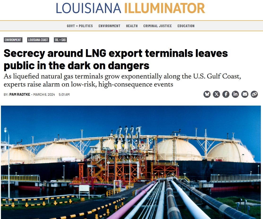 Unlike other industrial facilities, such as chemical plants and oil refineries, LNG operators don’t have to share with the general public information such as what chemicals are being used onsite and how an accident could impact the people who live around the facility.