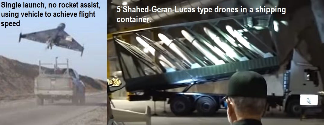 First, watch this very short video: “Launching Shahed-type drones from a moving pickup truck.” (So there is no need for rocket assisted launching)