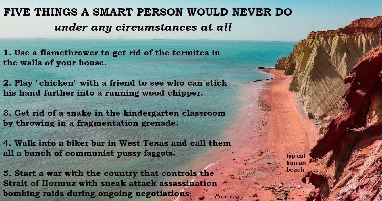 Folks, our enemies already have the ideas. We triggered a cascading global catastrophe with our insane sneak-attack war of choice. Now we will pay the piper. Nobody should expect the American homeland to be immune from the disastrous and 100% predictable chain of cause and effect that we ignited on February 28.