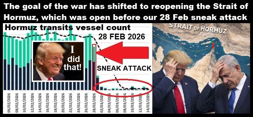 Back to today: And they will. Guaranteed. Even if we nuked Teheran, which is 700 miles north of the Strait of Hormuz. No matter how much destruction we rain on Iran, it will not reopen the Persian Gulf, and until shipping traffic is restored to pre-28-February levels, WE ARE LOSING, and the entire world is blaming us for the unfolding global economic depression that now appears unavoidable. Like a stroke victim who can’t breathe, more permanent damage is being done to the world economy with each passing day that the strait is closed to normal traffic.